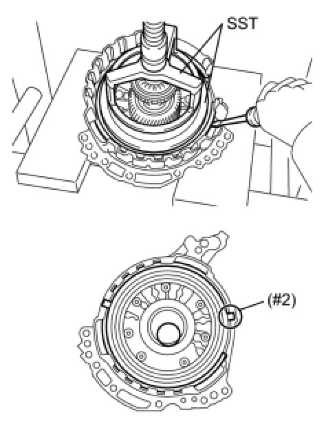 (e) Using a screwdriver, install the snap ring to the oil pump assembly as shown in the illustration (#2).