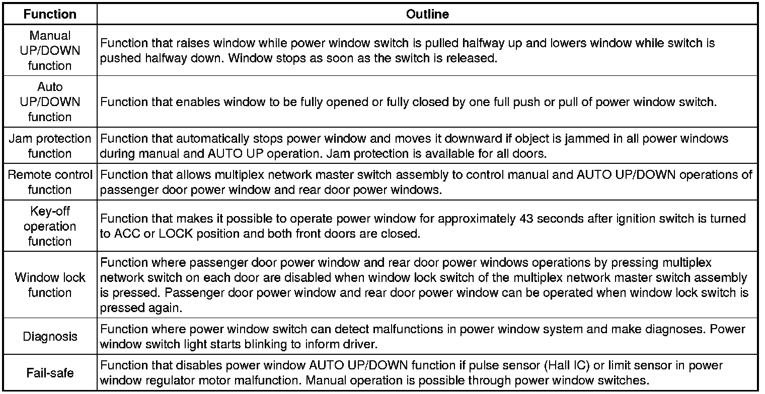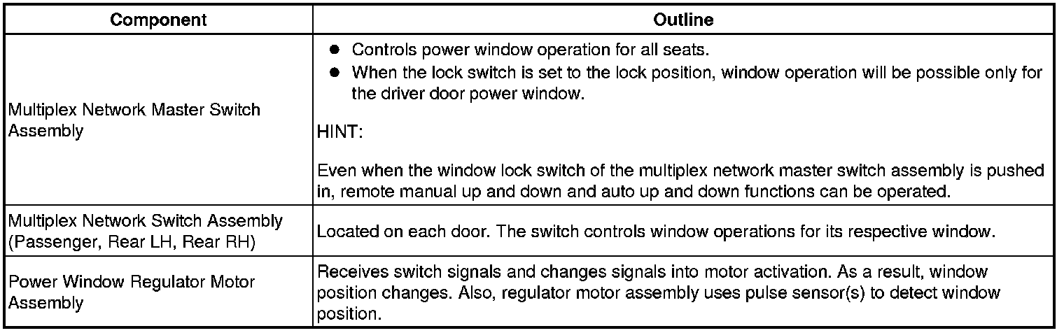 The main controls of this system are: the multiplex network master switch assembly, which is built into the driver side door, and the multiplex network switches, which are built into the passenger side door and rear doors. Pressing each switch on the multiplex network master switch assembly transmits a remote UP/DOWN signal to each multiplex network switch.