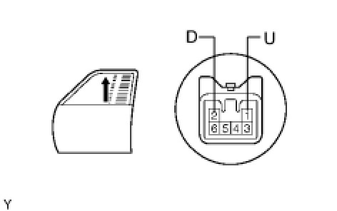 (6) Approximately 60 seconds later, connect the battery's positive (+) lead to terminal 2 (D) and the negative (-) lead to terminal 1 (U). Check that the window begins to descend.