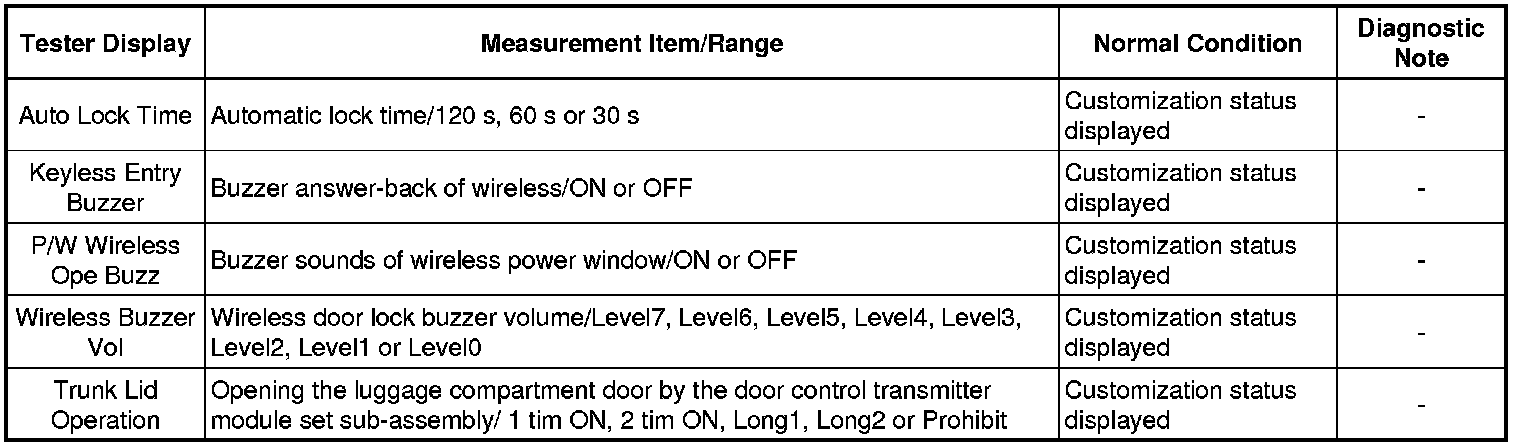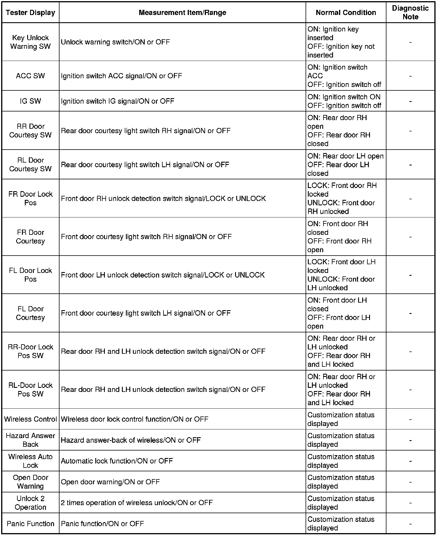 DOOR LOCK: WIRELESS DOOR LOCK CONTROL SYSTEM (w/o Smart Key System): DATA LIST / ACTIVE TEST