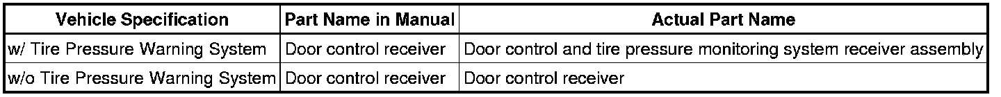 (a) The type of door control receiver used on this model differs according to the specifications of the vehicles. The expressions listed in the table below are used in this section.