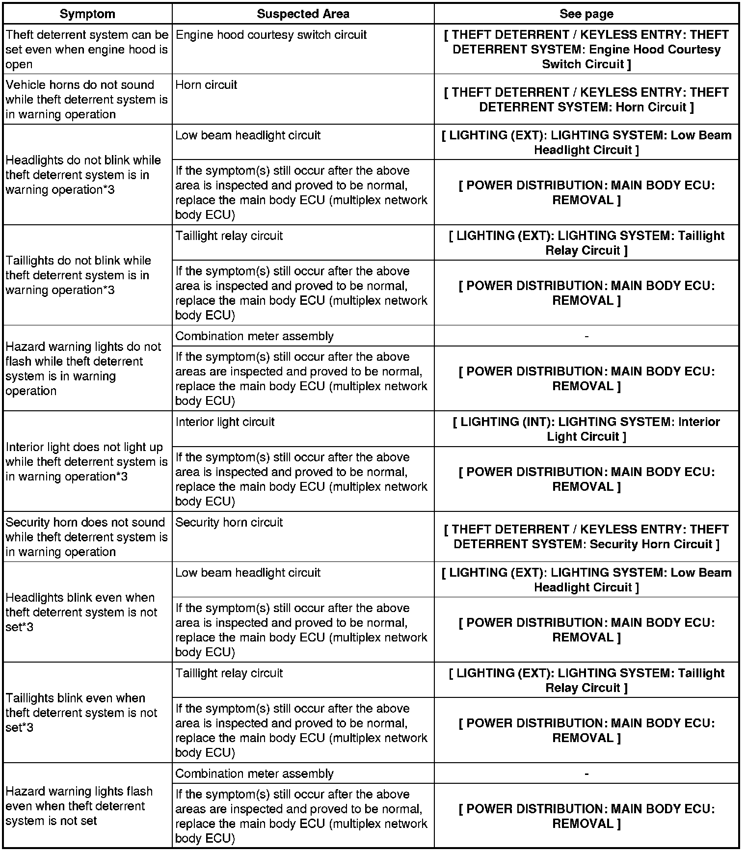 * Troubleshooting of the theft deterrent system is based on the premise that the power door lock control system and the wireless door lock control system are operating normally. Accordingly, before troubleshooting the theft deterrent system, first make certain that the power door lock control system and the wireless door lock control system are operating normally.