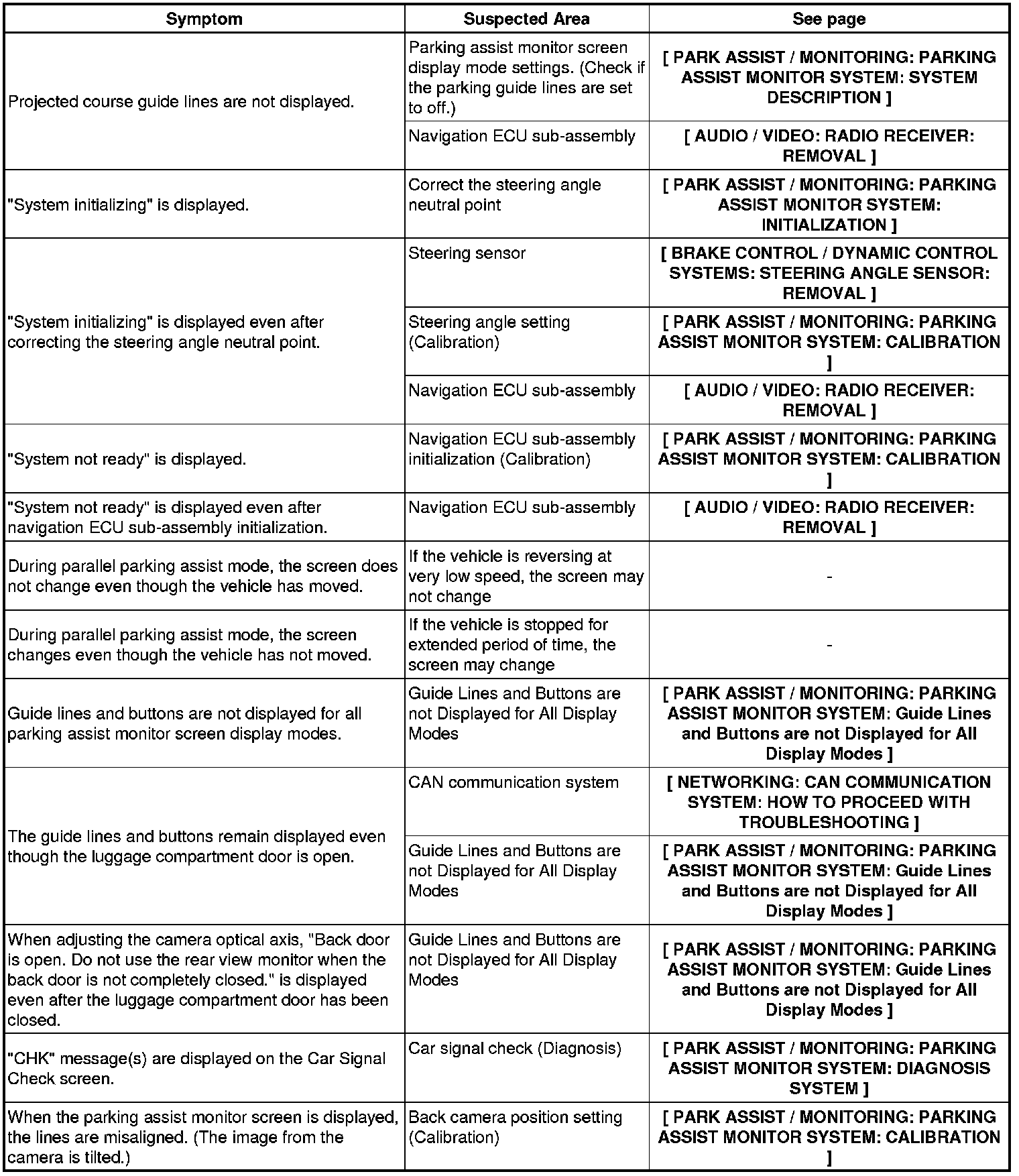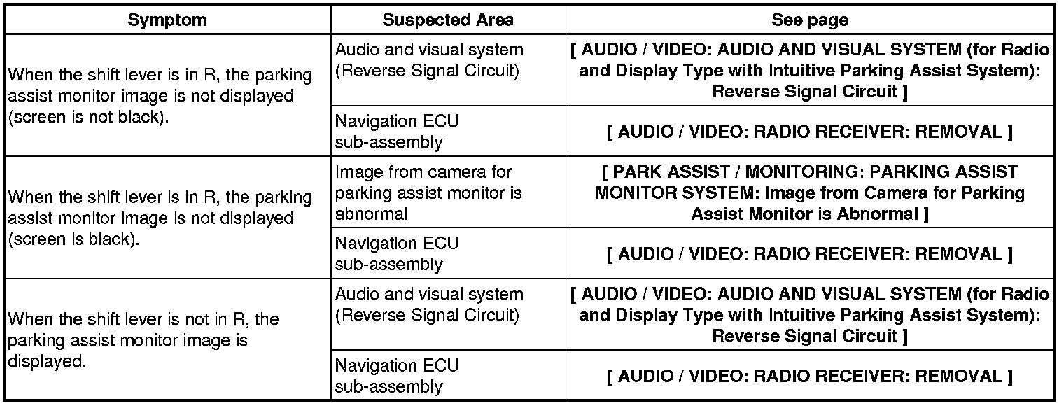 PARK ASSIST / MONITORING: PARKING ASSIST MONITOR SYSTEM: PROBLEM SYMPTOMS TABLE