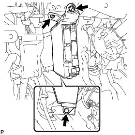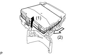 (d) Raise the main body ECU (multiplex network body ECU) as shown by the arrow (1), and then pull it out as shown by the arrow (2) in the illustration.