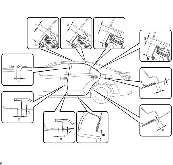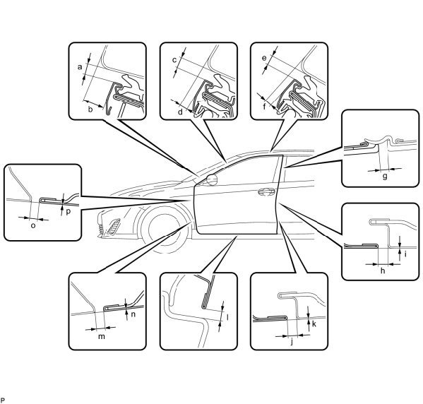 a. Check that the clearance measurements of areas a through p are within each standard range.