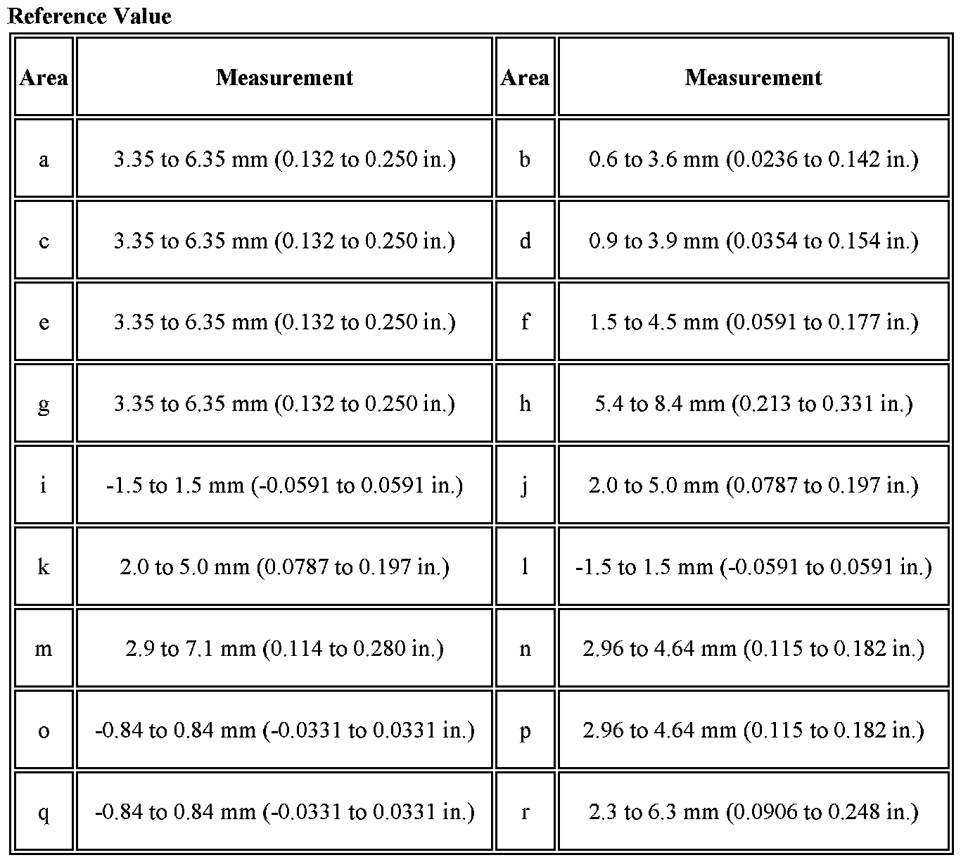 a. Check that the clearance measurements of areas a through r are within each standard range.