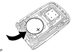 (1) Install a new transmitter battery (lithium battery: CR2032) with the positive (+) side facing upward, as shown in the illustration.