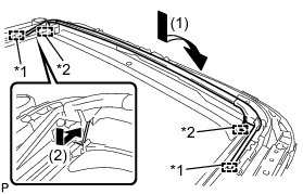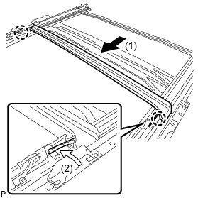 (b) Engage the 2 claws in the direction indicated by the arrow (2) in the illustration to install the rear sliding roof panel.