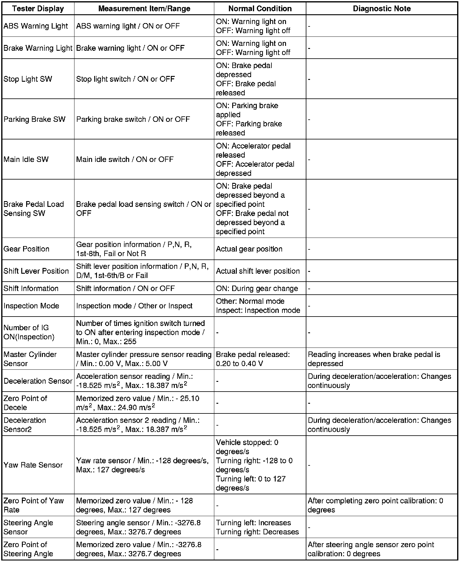 Using the Techstream to read the Data List allows the values or states of switches, sensors, actuators and other items to be read without removing any parts. This non-intrusive inspection can be very useful because intermittent conditions or signals may be discovered before parts or wiring is disturbed. Reading the Data List information early in troubleshooting is one way to save diagnostic time.