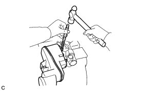 (b) Using a pin punch and a hammer, tap in the brake master cylinder straight pin to secure the brake master cylinder reservoir sub-assembly.
