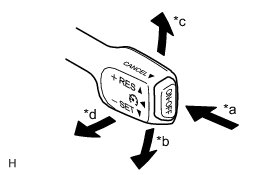 The cruise control switch is used to turn the cruise control system on and off, as well as operate 7 functions: SET, - (COAST), TAP-DOWN, RES (RESUME), + (ACCEL), TAP-UP and CANCEL. The SET, TAP-DOWN and - (COAST) functions, and the RES (RESUME), TAP-UP and + (ACCEL) functions are operated with the same switch. The cruise control switch is an automatic return type switch which turns on only while operating it in the direction of each arrow and turns off after releasing it. The internal contact points of the cruise control switch turn on with switch operation. Then the ECM reads the voltage value that has been changed by the switch operation to control SET, - (COAST), RES (RESUME), + (ACCEL), and CANCEL.