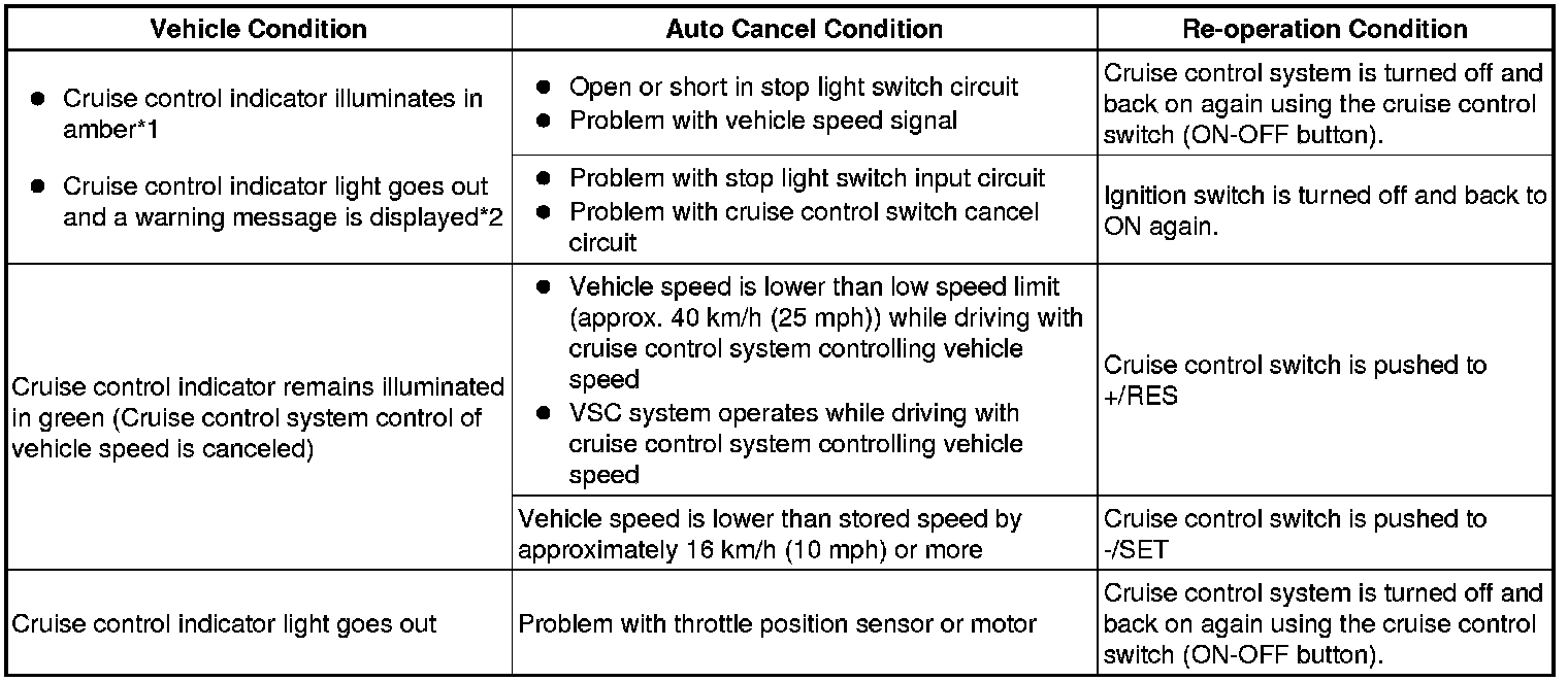 If the following conditions are detected while the cruise control system is controlling vehicle speed, the system clears the vehicle speed stored in the ECM and cancels cruise control system control of vehicle speed.