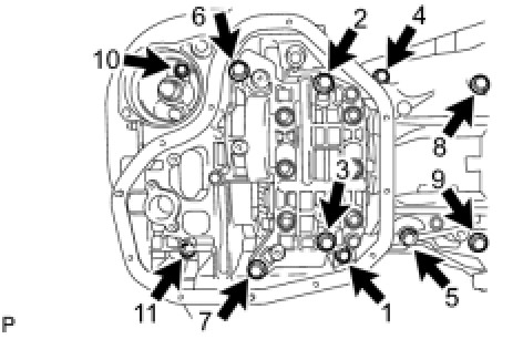 (b) Install the oil pan with the 11 bolts and 2 nuts in several steps, in the sequence shown in the illustration.
