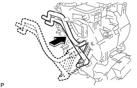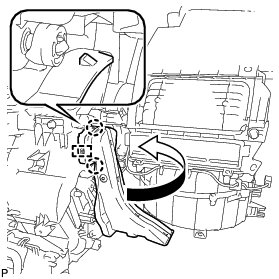 (d) Rotate the link of the air conditioning radiator assembly to the bottom as shown in the illustration and confirm that the mode switching duct hole is fully closed.
