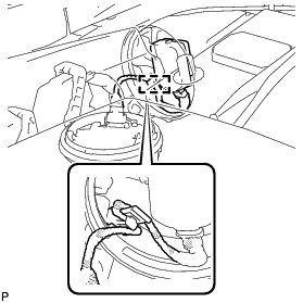 (b) Check that the red line on the output harness is not twisted and store the harness in the headlight assembly securely so that the output harness is not pinched.