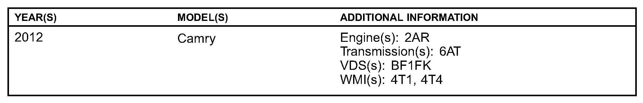 Some 2012 Camry vehicles may exhibit an intermittent shudder when lightly accelerating after an upshift around the following speeds: 26 mph (42km/h) (4th), 36 mph (58 km/h) (5th) and/or 44 mph (71 km/h) (6th). Changes have been made in the torque converter assembly to reduce this condition. Refer to the repair procedure below for diagnostic instructions to confirm if the torque converter needs to be replaced to address this