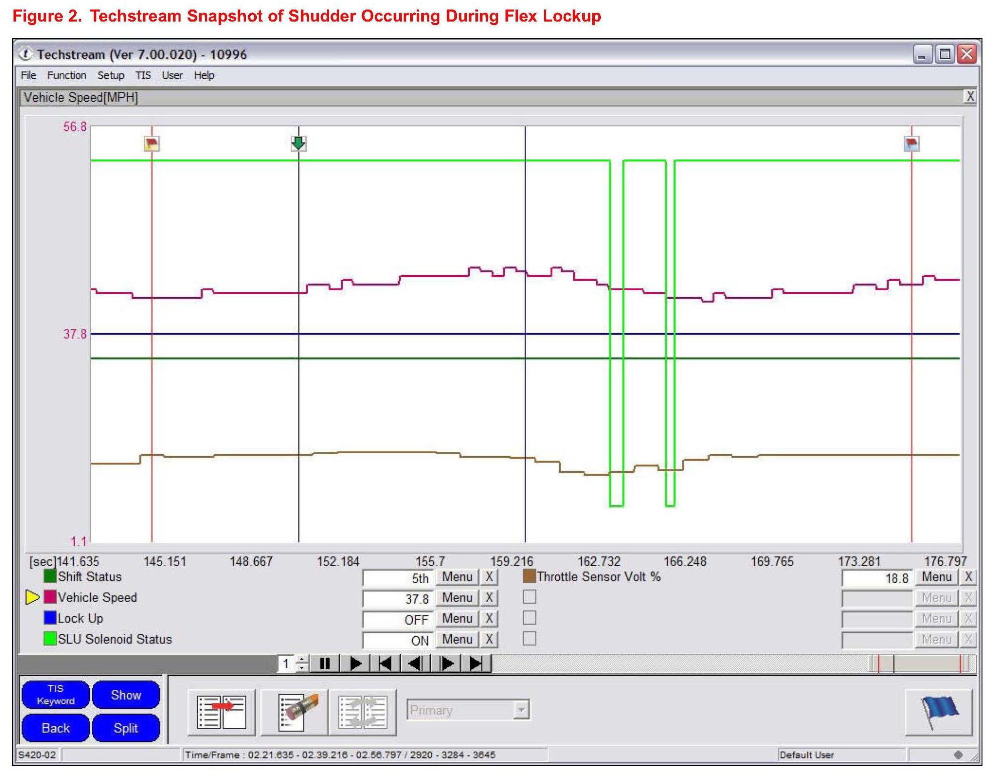 3. Use Techstream to take a snapshot when shudder is occurring to determine if it is occurring during flex lockup.