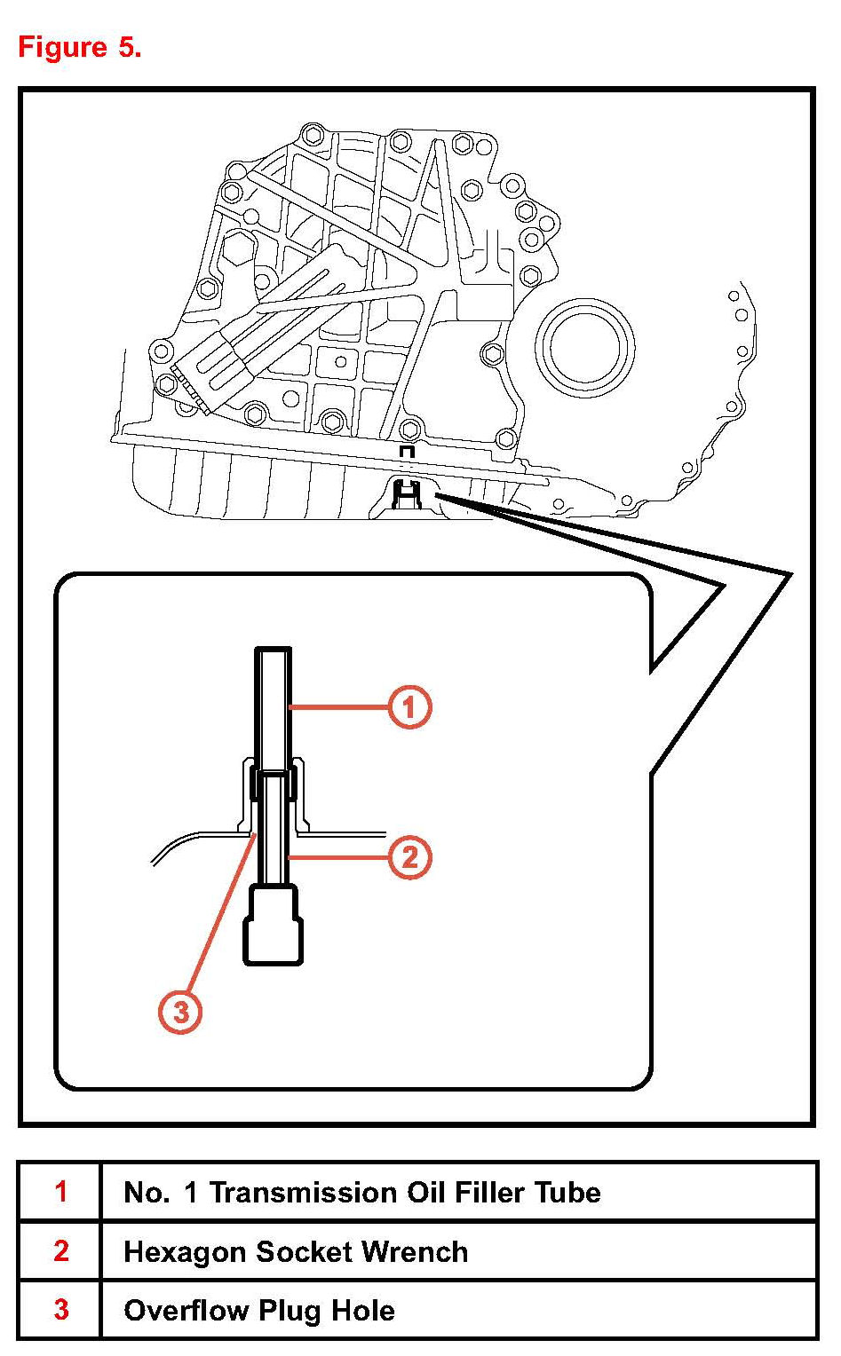 G. Using a 6 mm hexagon socket wrench, install the No. 1 transmission oil filler tube to the oil pan.