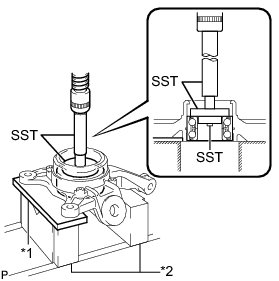 (b) Using SST, a steel plate, V-blocks and a press, remove the front axle hub bearing from the steering knuckle.