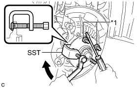 (c) Using SST and a screwdriver or an equivalent tool to hold the front axle hub, remove the front axle hub bolt.