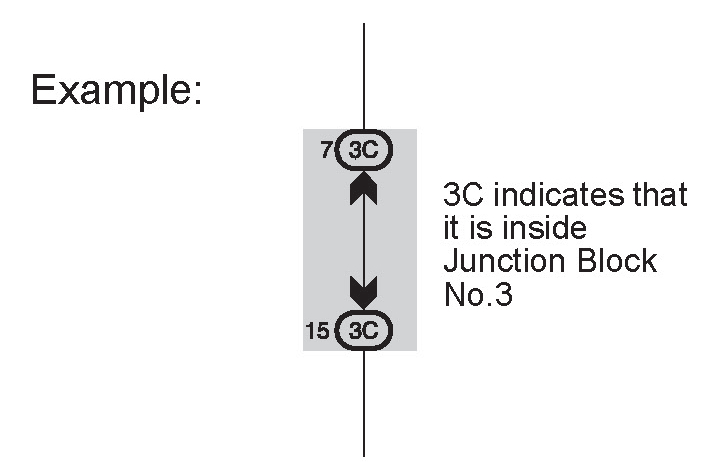 [E] : Indicates the code for the (male and female) connectors which are used to join two wire harnesses. The connector code consists of two alphabetical and one numerical characters.