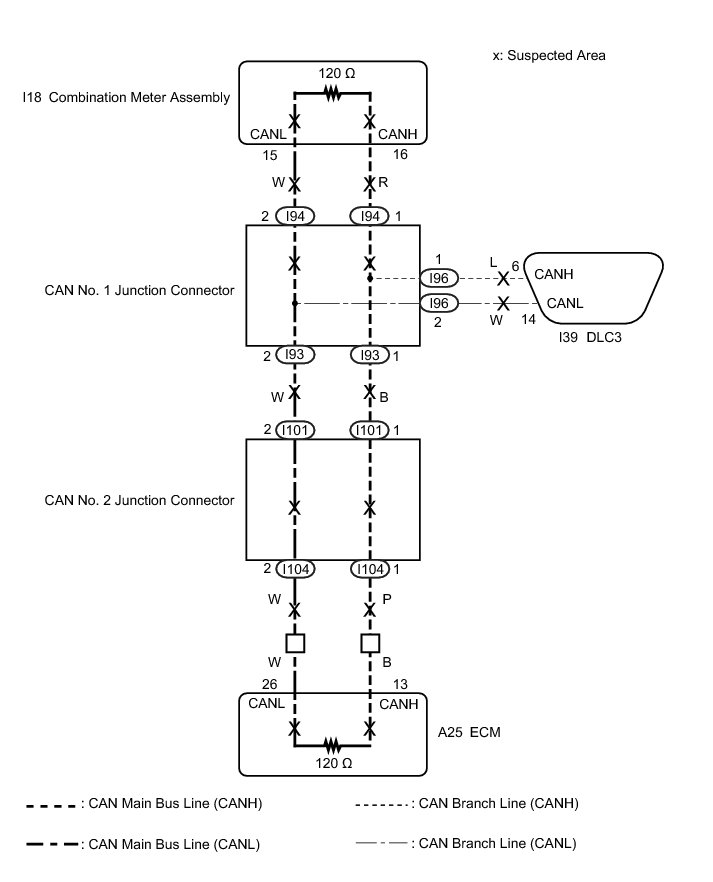 There may be an open circuit in one of the V Bus main lines and/or a DLC3 branch line when the resistance between terminals 6 (CANH) and 14 (CANL) of the DLC3 is 70 Ohms or higher.