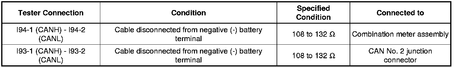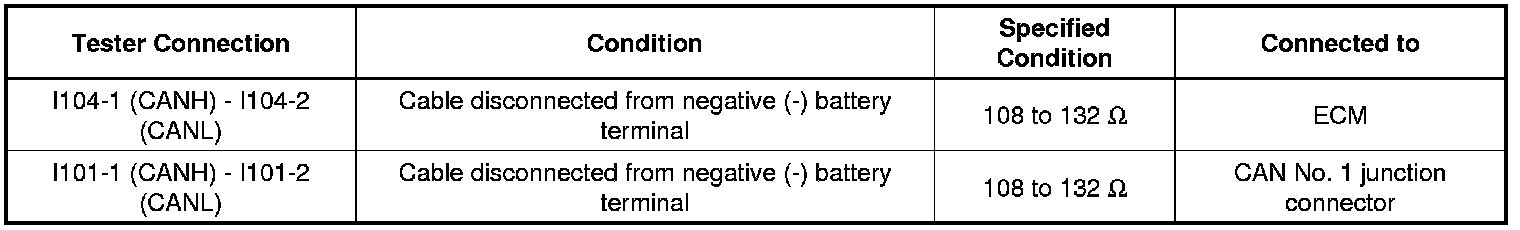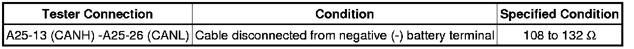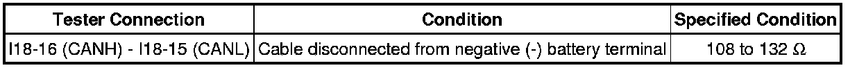 * Before measuring the resistance of the CAN bus, turn the ignition switch off and leave the vehicle for 1 minute or more without operating the key, switches or opening or closing the doors. After that, disconnect the cable from the negative (-) battery terminal and leave the vehicle for 1 minute or more before measuring the resistance.