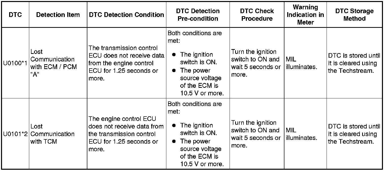 * Even though a DTC title may indicate a communication error with a specific ECU, the ECU name used in the DTC name on the Techstream may differ depending on the ECU that stores the DTC. (Regarding output DTCs, refer to step 6 and the DTC chart for each ECU.)