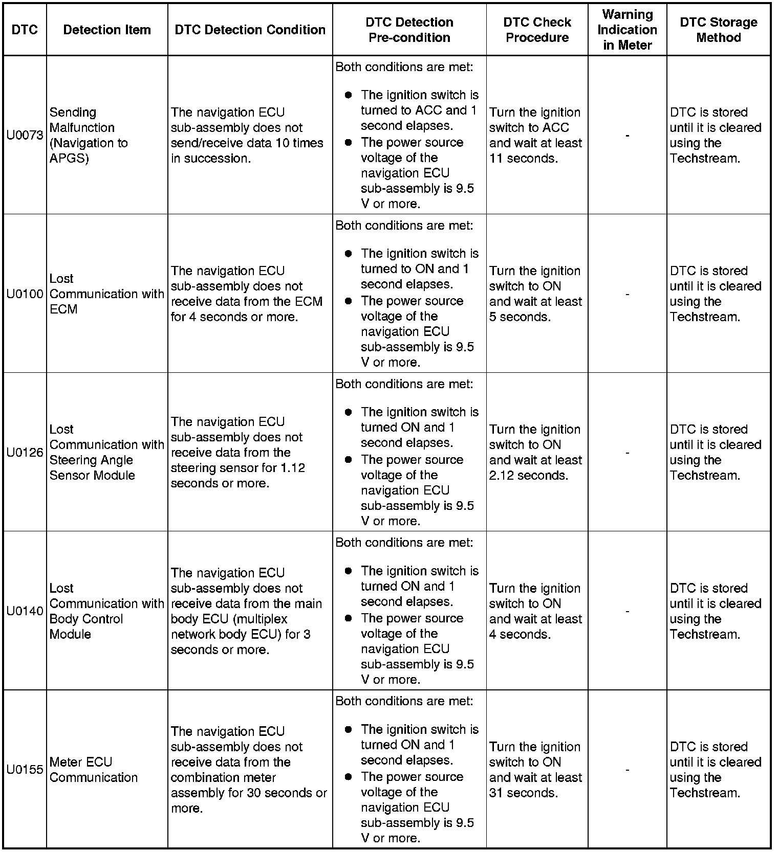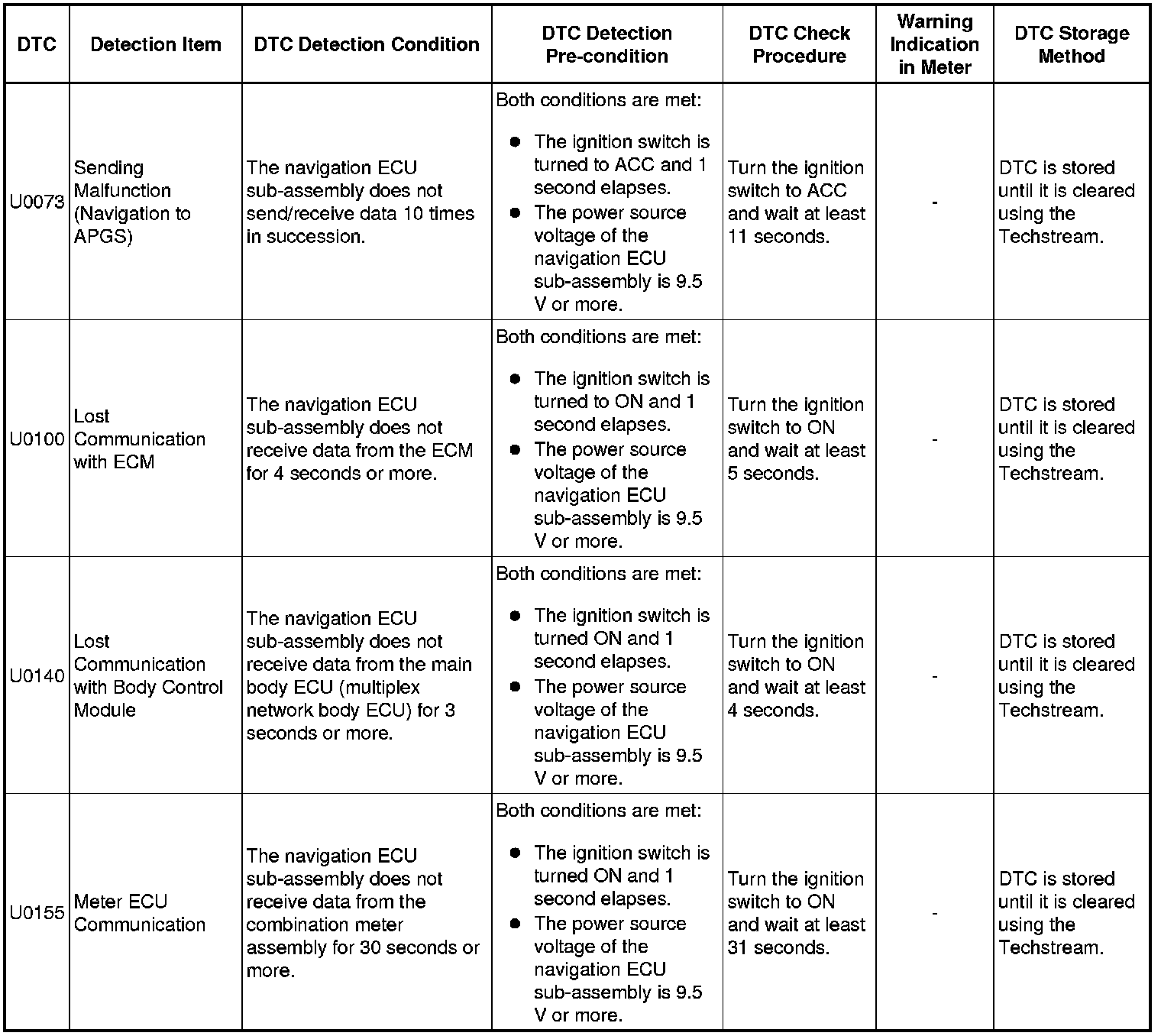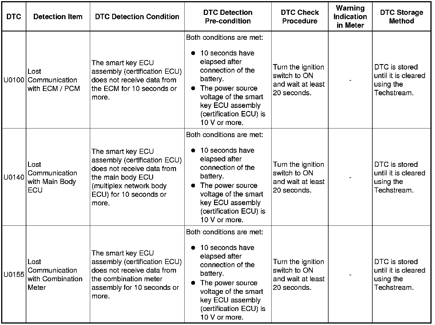Communication DTCs (DTCs that start with U) indicate a communication error between the ECU that stores the DTC and the ECU that is indicated by the DTC.
