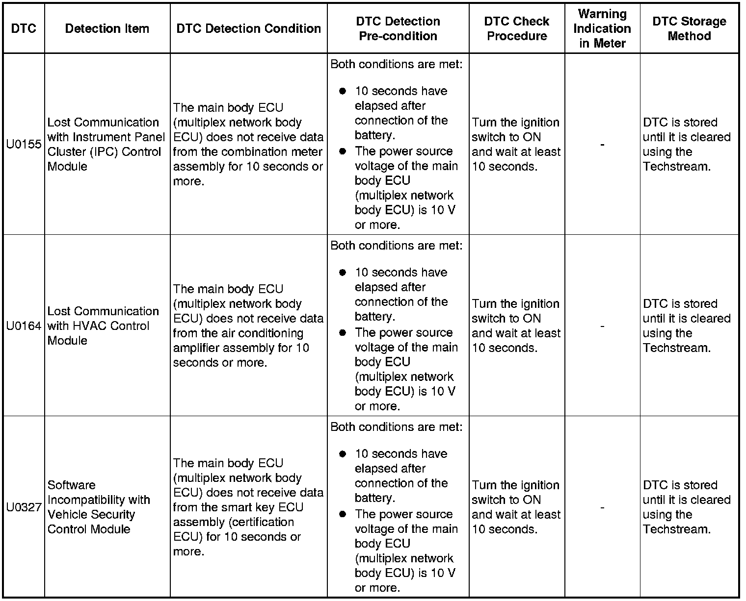 This DTC table is from another model, and is only used here to show an example of DTCs that are output when there is an open in a CAN branch line for the main body ECU. This table does not show DTCs applicable to this vehicle.