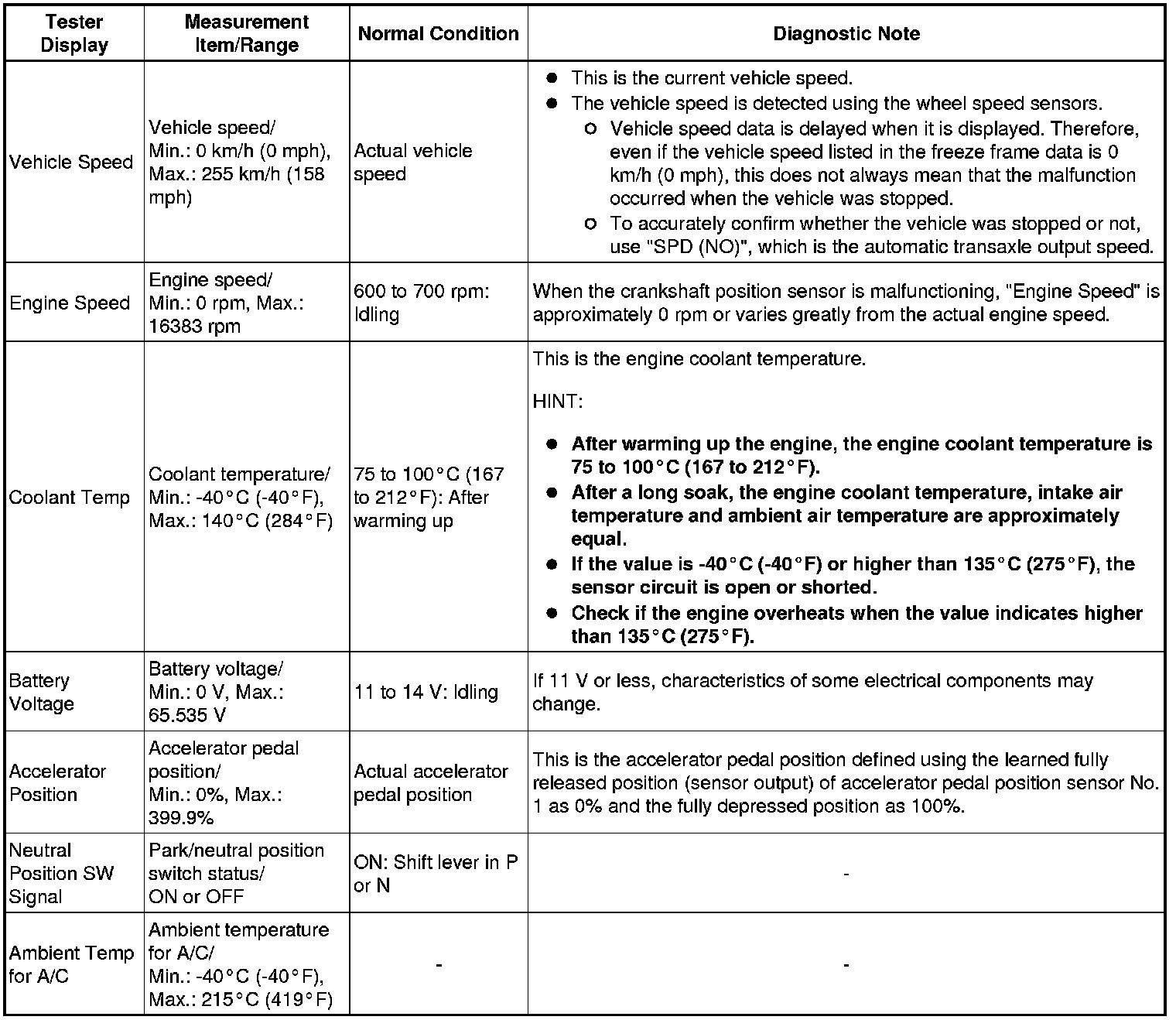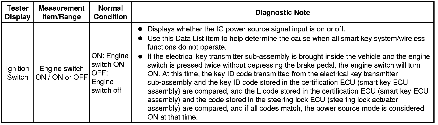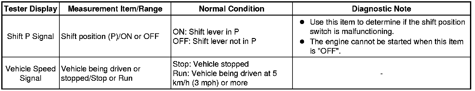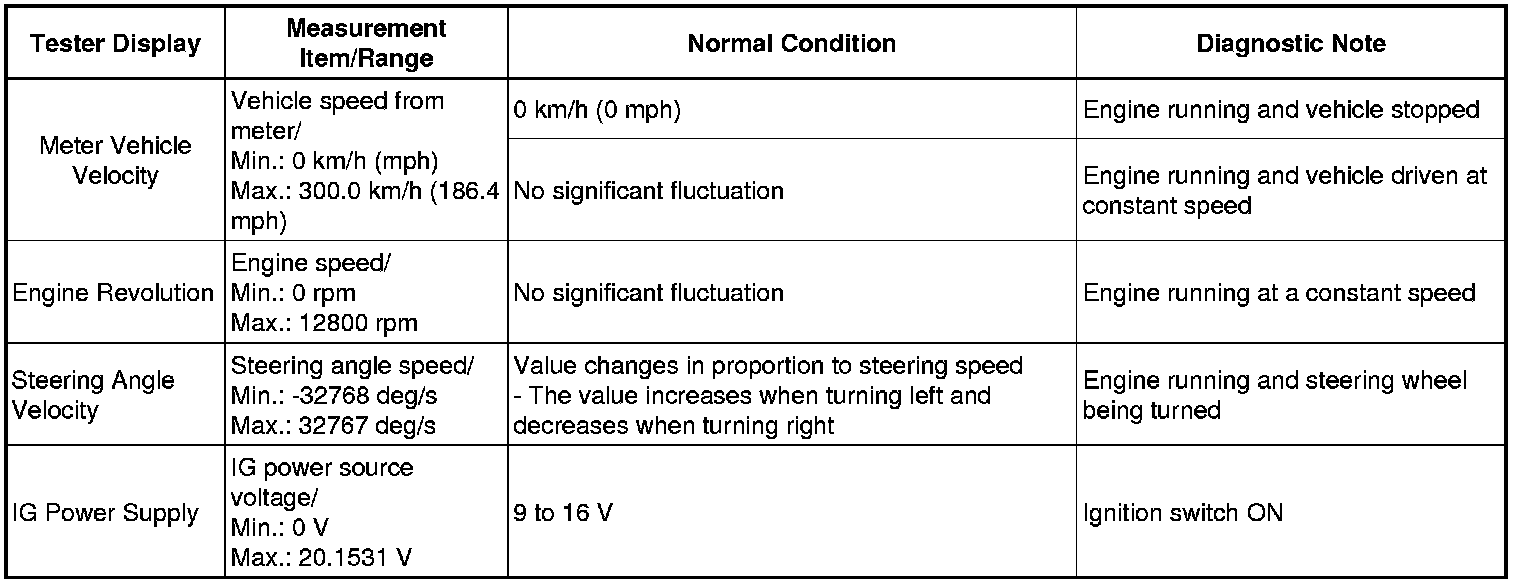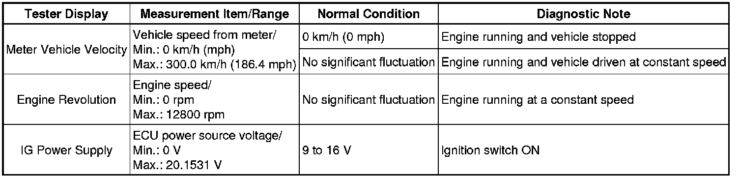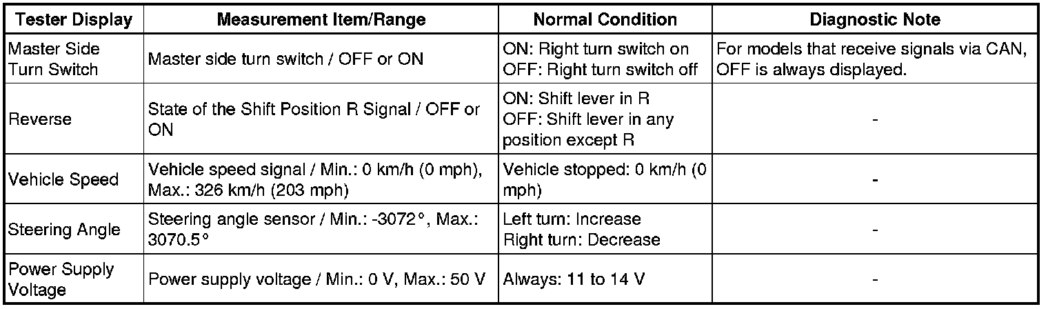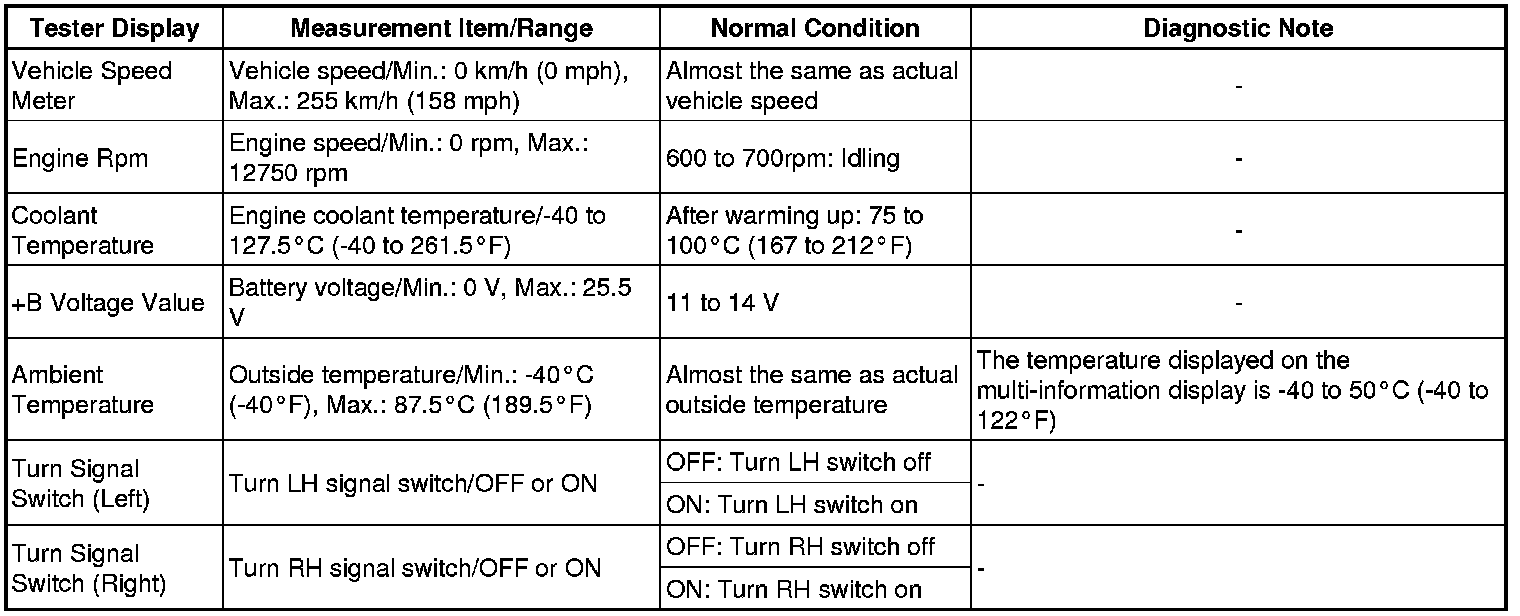 * Using the Techstream to read the Data List allows the values or states of switches, sensors, actuators and other items to be read without removing any parts. This non-intrusive inspection can be very useful because intermittent conditions or signals may be discovered before parts or wiring is disturbed. Reading the Data List information early in troubleshooting is one way to save diagnostic time.