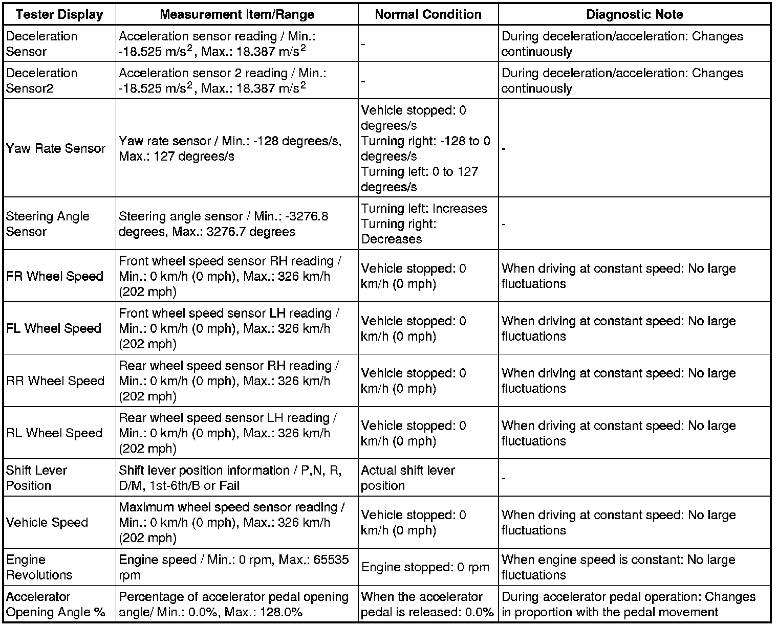 In the table below, the values listed under "Normal Condition" are reference values. Do not depend solely on these reference values when deciding whether a part is faulty or not.