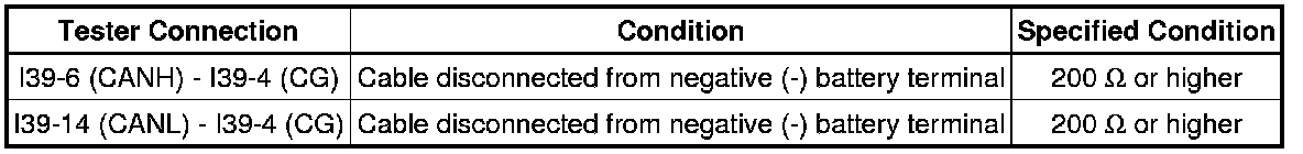 * Before measuring the resistance of the CAN bus, turn the ignition switch off and leave the vehicle for 1 minute or more without operating the key, switches or opening or closing the doors. After that, disconnect the cable from the negative (-) battery terminal and leave the vehicle for 1 minute or more before measuring the resistance.