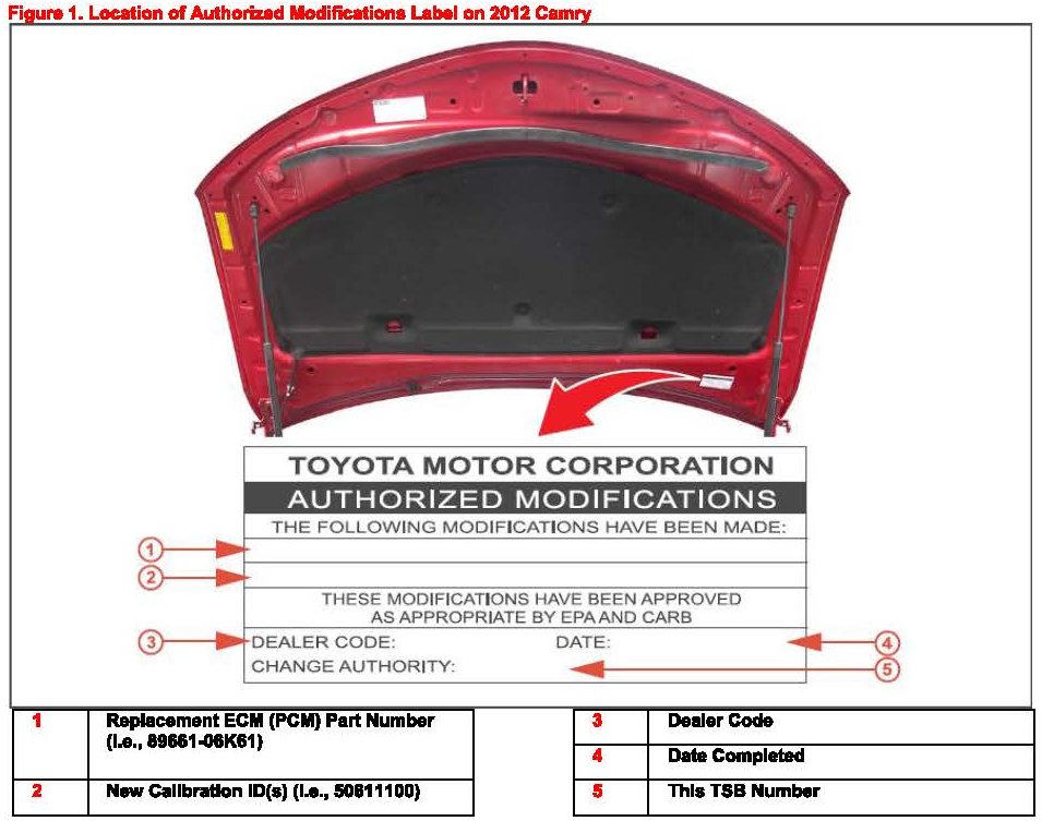 1. Check for the Authorized Modifications Label affixed to the vehicle in the location shown in Figure 1. Confirm if the ECM (PCM) calibration has been updated. If the calibration ID listed is NOT the latest ECM (PCM) calibrations - go to step 2.