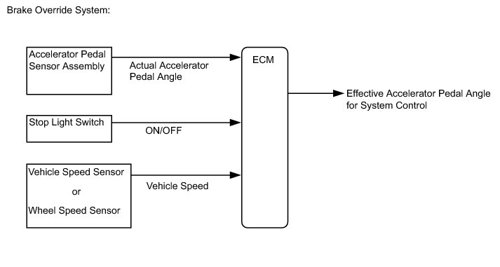 When the vehicle is being driven, depressing the accelerator pedal sensor assembly and brake pedal will activate the brake override system to restrict driving torque. The conditions for activating the brake override system as well as the items that are controlled are explained below.