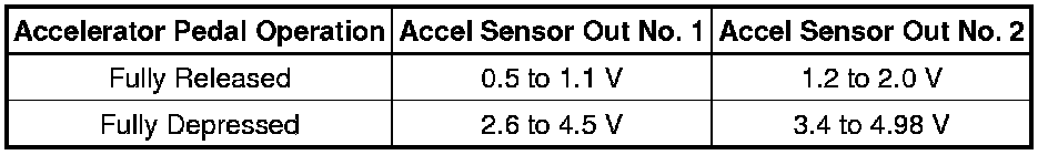If the result is not as specified, check the accelerator pedal sensor assembly, wire harness or ECM.