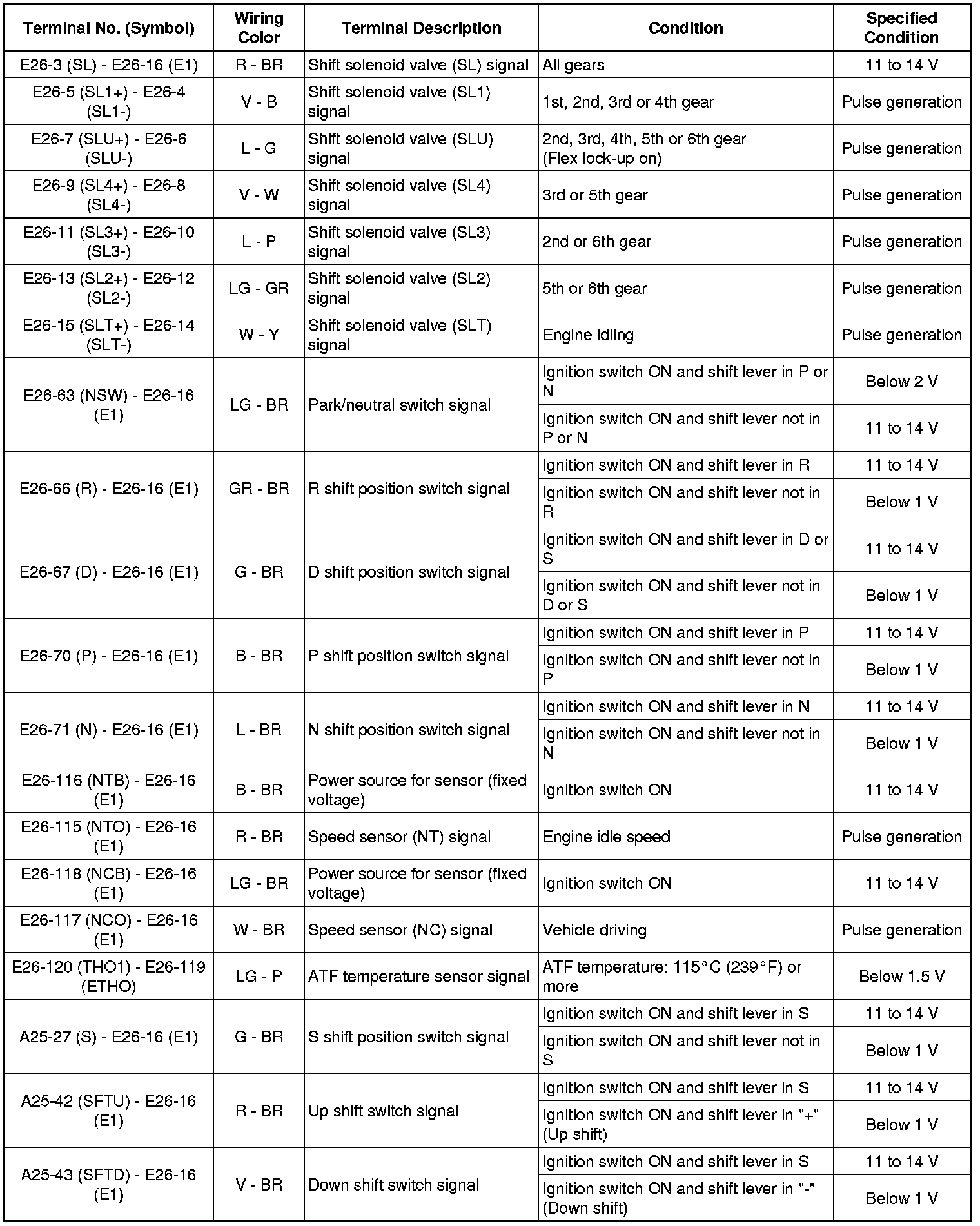 The standard voltage between each pair of ECM terminals is shown in the table below. The appropriate conditions for checking each pair of terminals are also indicated. The result of checks should be compared with the standard voltage for that pair of terminals, displayed in the "Specified Condition" column. The illustration above can be used as a reference to identify the ECM terminal locations.