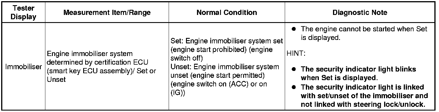 It is determined that the engine immobiliser function is operating correctly if the security indicator light changes from blinking to off at the same time that the power source mode changes to on (ACC).