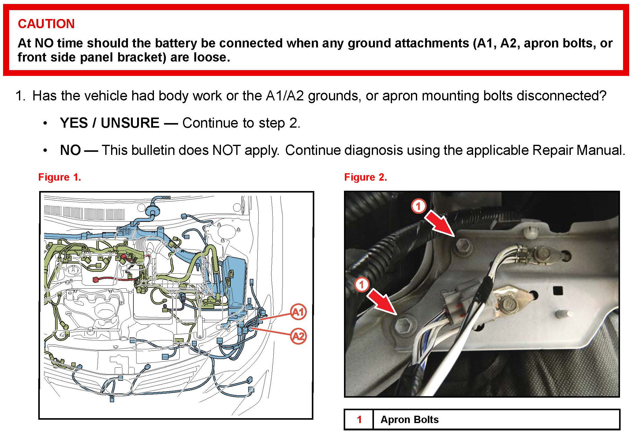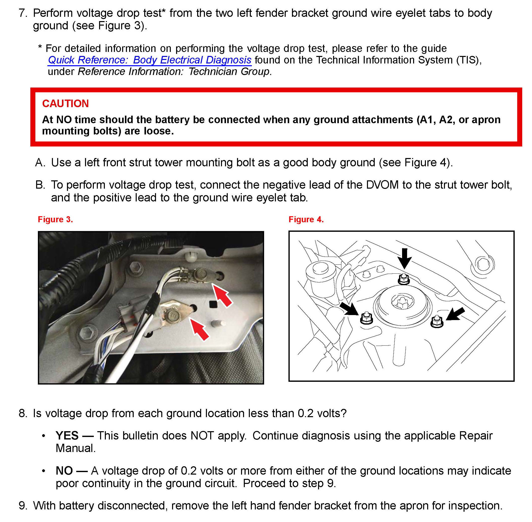 BEFORE performing work on electronic components, components including grounds, or fenderbrackets with grounds, disconnect the cable from the negative (-) battery terminal to preventdamage to the electrical system or components.