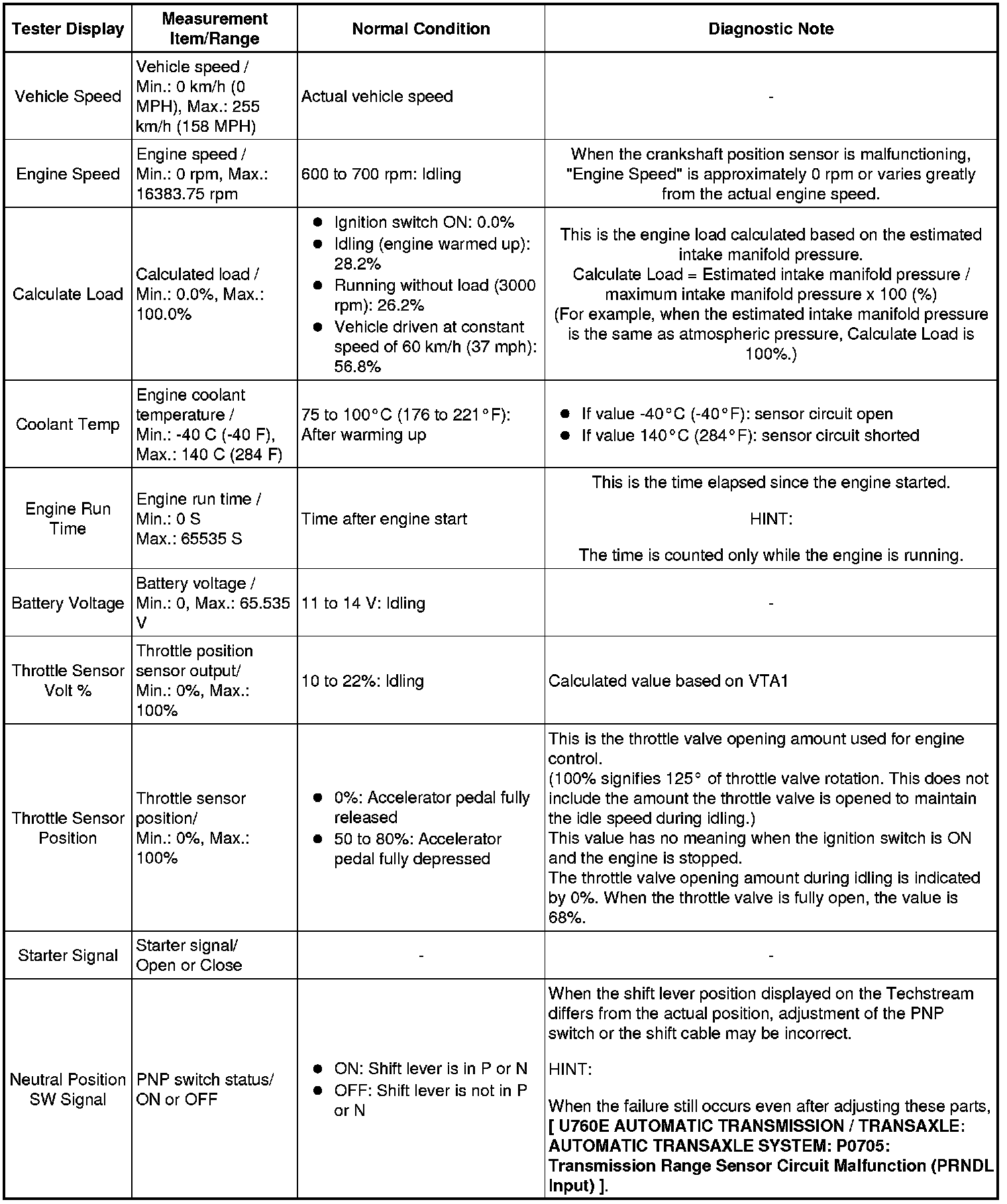 Using the Techstream to read the Data List allows the values or states of switches, sensors, actuators and other items to be read without removing any parts. This non-intrusive inspection can be very useful because intermittent conditions or signals may be discovered before parts or wiring is disturbed. Reading the Data List information early in troubleshooting is one way to save diagnostic time.