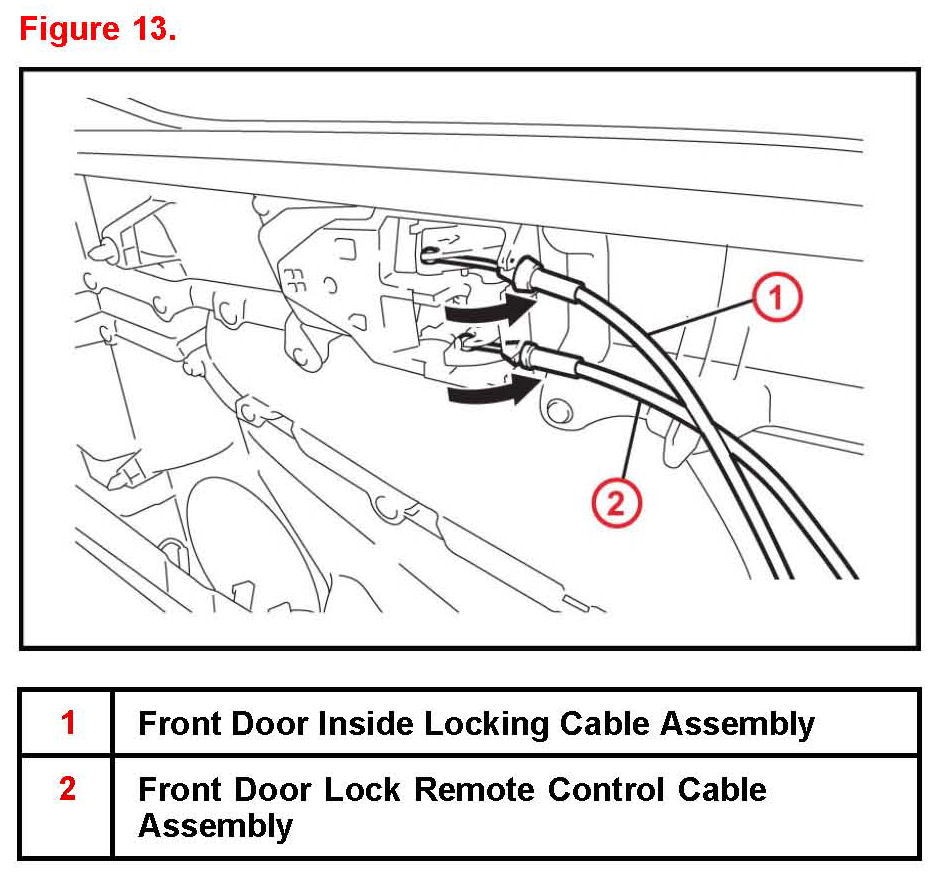 A. Connect the front door lock remote control cable assembly and front door inside locking cable assembly.
