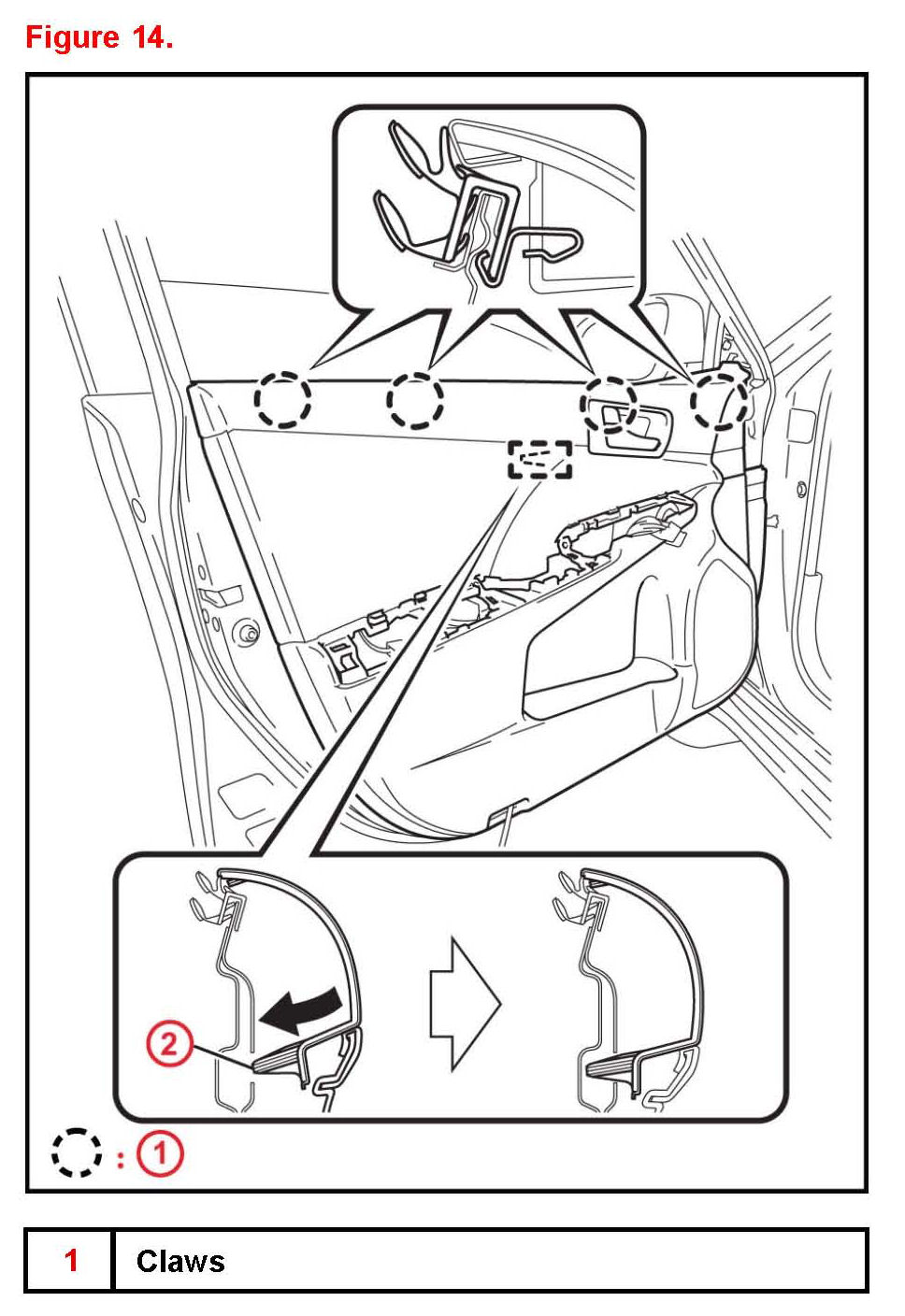 B. Engage the front door trim board sub-assembly with the 4 claws and reference boss as shown in Figure 14.