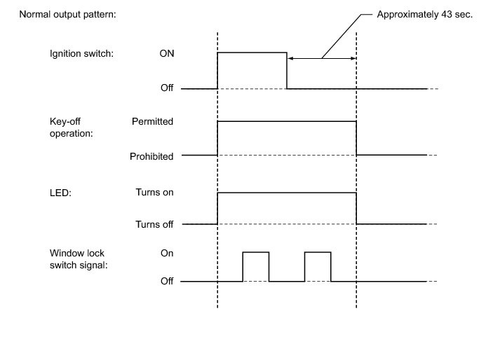 During normal operation (fail-safe is not operating), or during fail-safe mode when there is a pulse sensor malfunction or the window position or learned value is abnormal, the LED illuminates as shown in the illustration.