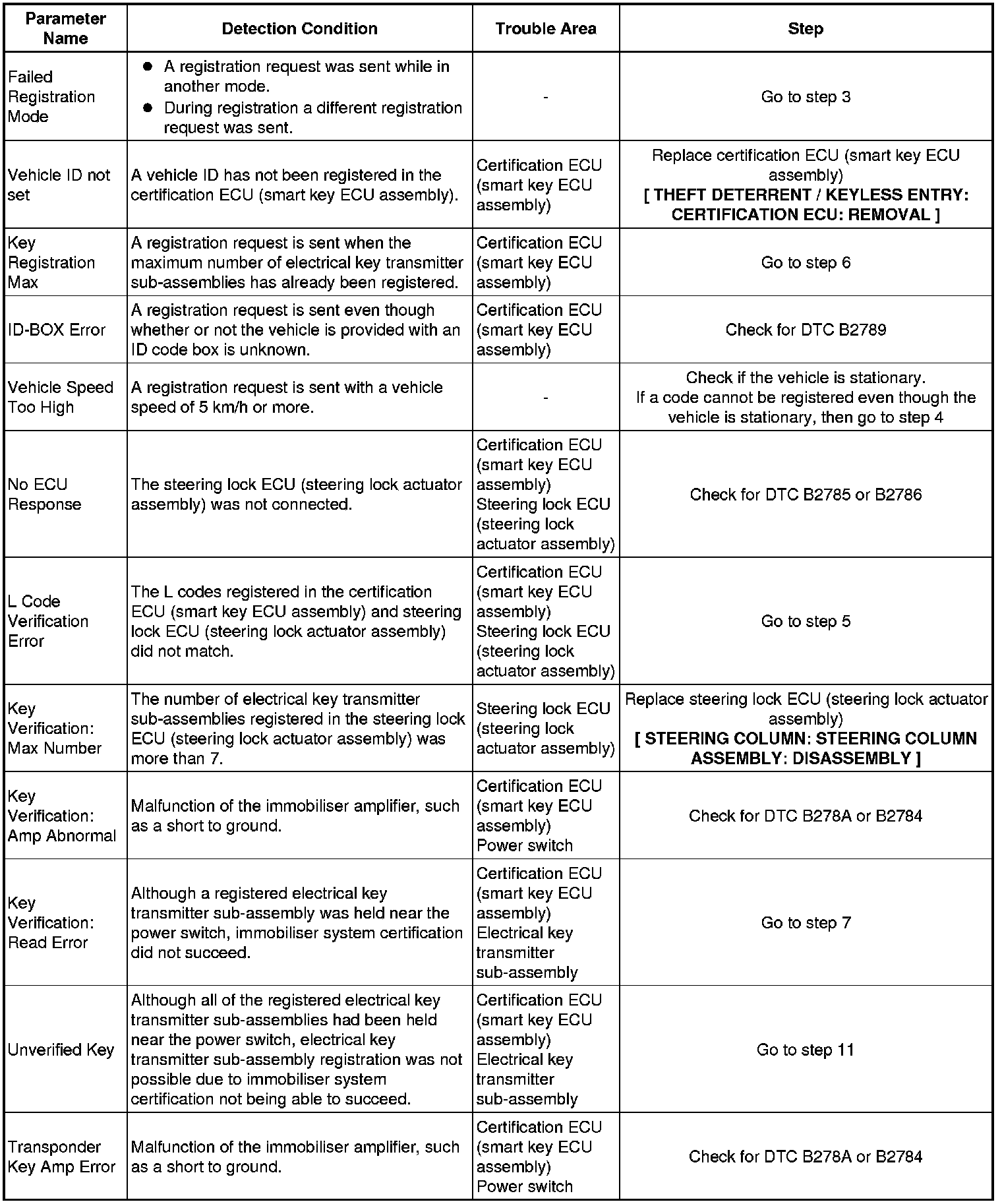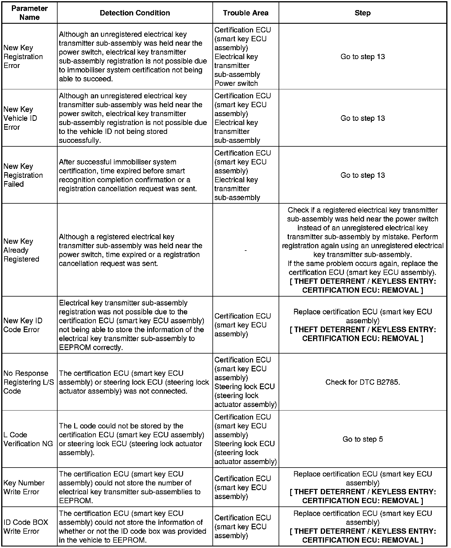 If an electrical key transmitter could not be newly registered, wave interference or a malfunction of the certification ECU (smart key ECU assembly), electrical key transmitter sub-assembly, steering lock ECU (steering lock actuator assembly) or door control receiver is suspected.