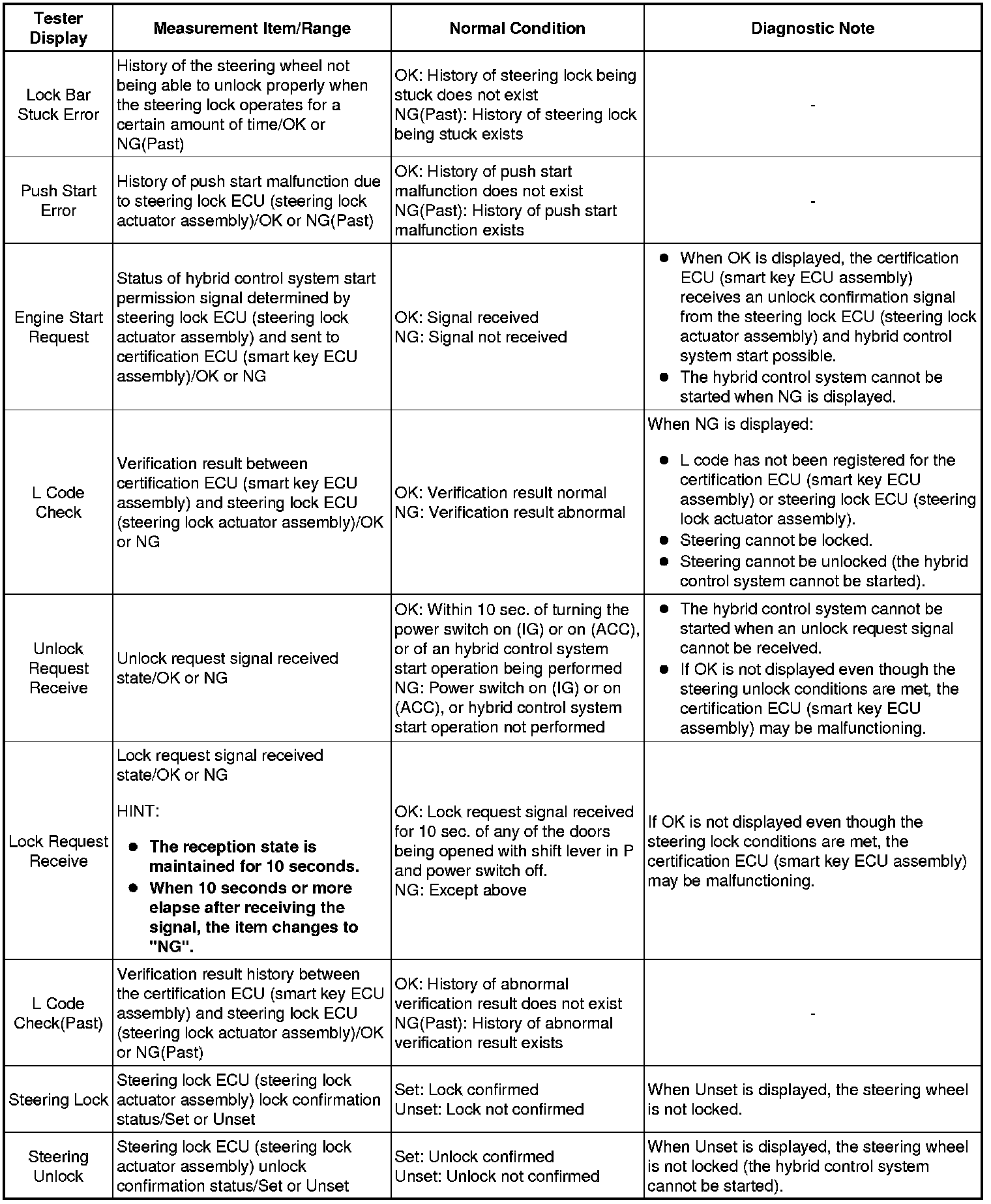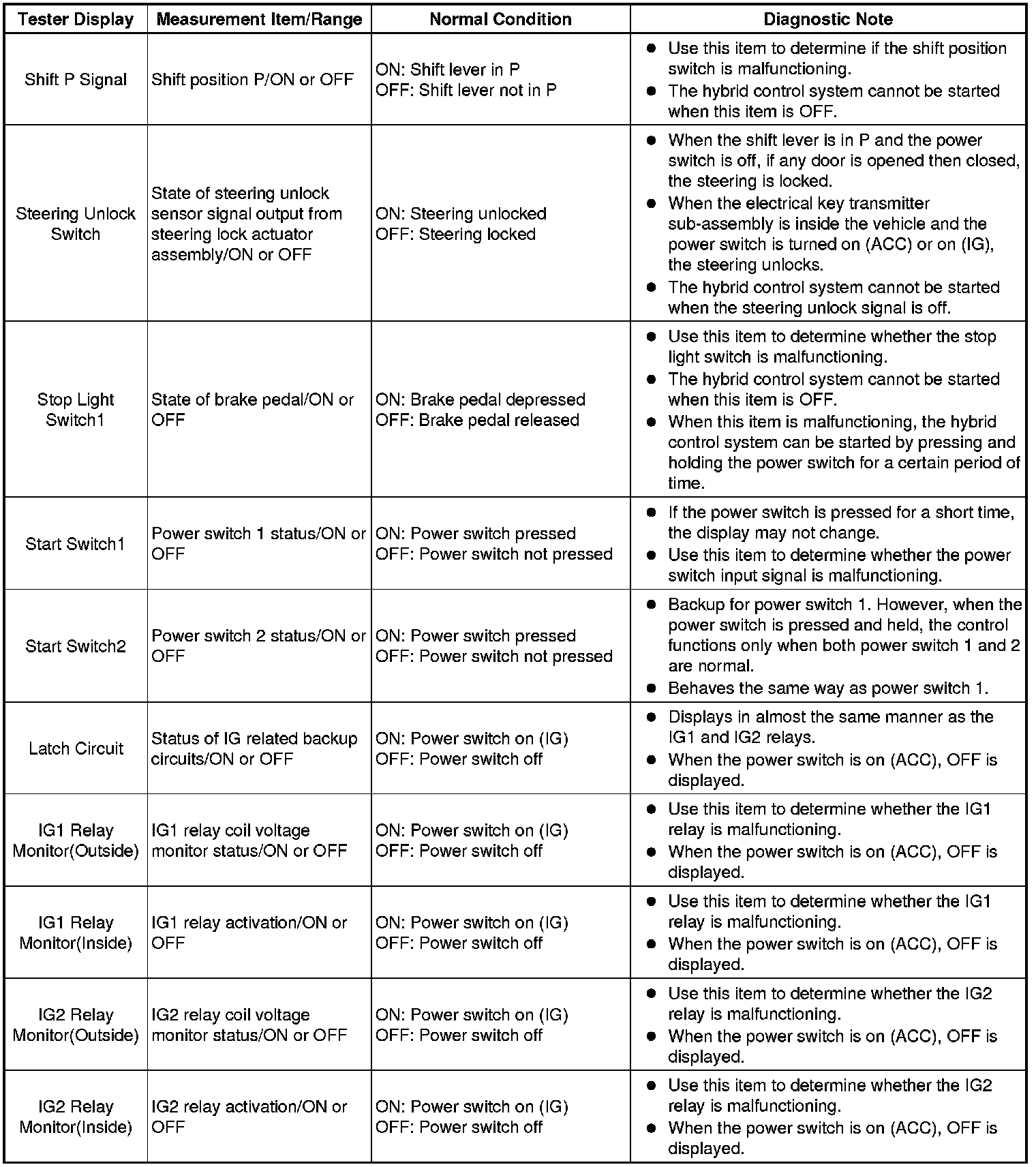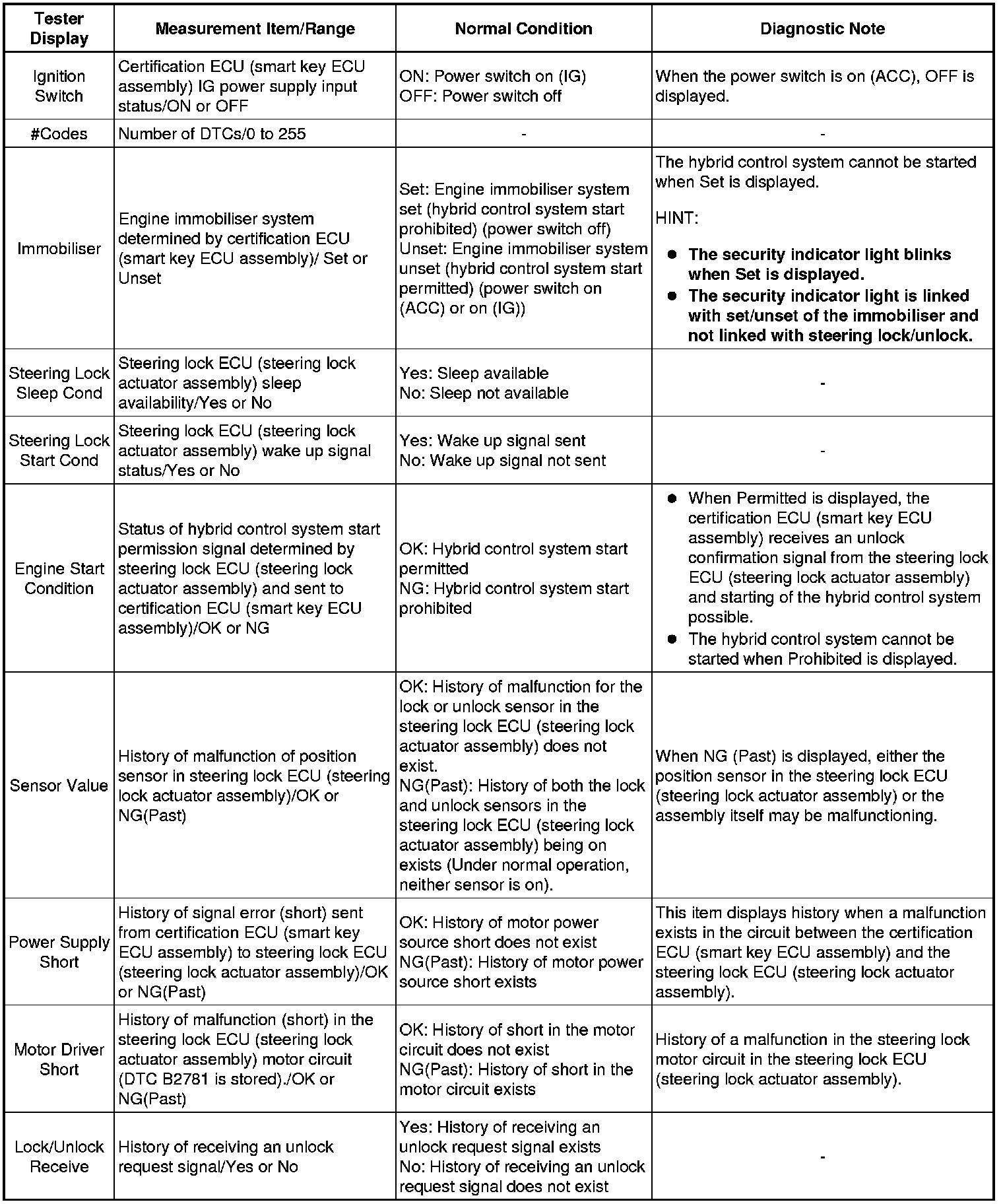 Using the Techstream to read the Data List allows the values or states of switches, sensors, actuators and other items to be read without removing any parts. This non-intrusive inspection can be very useful because intermittent conditions or signals may be discovered before parts or wiring is disturbed. Reading the Data List information early in troubleshooting is one way to save diagnostic time.