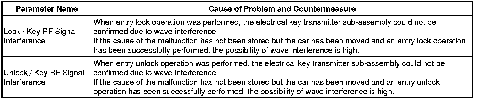 * If the cause of the malfunction is stored in the certification ECU (smart key ECU assembly), the following table is helpful in checking whether or not the malfunction was caused by wave interference.