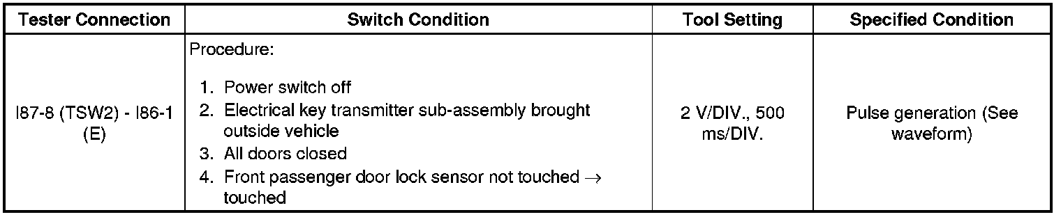 If the entry lock function does not operate for the front passenger door only, but the entry unlock function operates, the request code is being transmitted properly from the front passenger door. In this case, there may be a problem related to the front door outside handle assembly RH (for front passenger door) (lock sensor) (connection between the certification ECU (smart key ECU assembly) and front door outside handle assembly RH (for front passenger door) [lock sensor]).