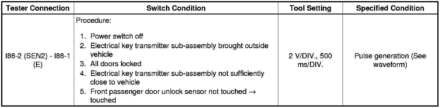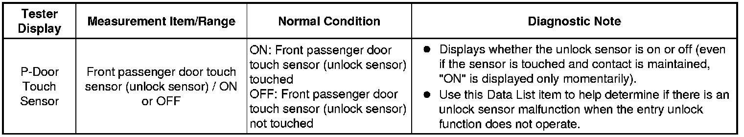 If the entry unlock function does not operate for the front passenger door only, but the entry lock function operates, the request code is being transmitted properly from the front passenger door. In this case, there may be a problem related to the touch sensor (connection between the certification ECU (smart key ECU assembly) and front door outside handle assembly RH (for front passenger door) [unlock sensor]).