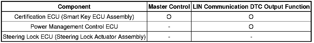 The LIN communication system is used for communication between the components in the tables below. If communication cannot be performed through LIN communication because of an open in the communication lines or other reasons, the master control ECU of the relevant system will store a DTC. Refer to the table below about the communication bus lines and connected components.