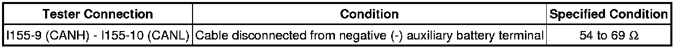 * Before measuring the resistance of the CAN bus, turn the power switch off and leave the vehicle for 1 minute or more without operating the key, switches or opening or closing the doors. After that, disconnect the cable from the negative (-) auxiliary battery terminal and leave the vehicle for 1 minute or more before measuring the resistance.